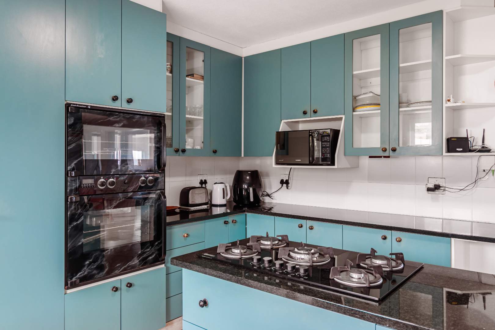 The main kitchen is both stylish and practical, offering ample cabinetry, a gas hob, eye-level oven, and space for laundry appliances, with additional room for a breakfast or dining nook.