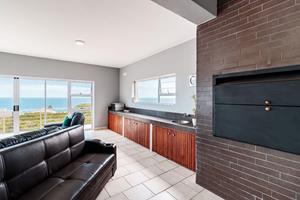 - Expansive partially covered patio with roll-down canvas blinds & ocean views