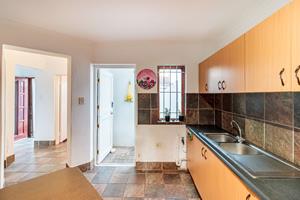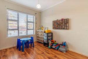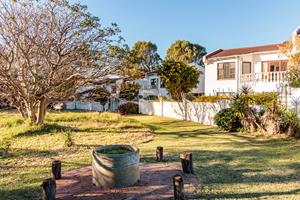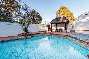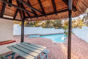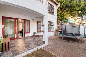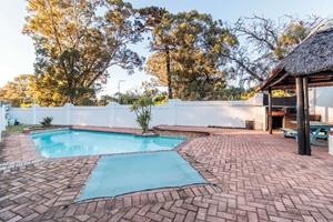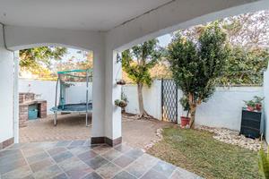 Double doors open to an enchanting outdoor entertainment area: a covered patio, grassed play area, and paved courtyard with built-in braai – fully walled and ideal for entertaining or family fun.