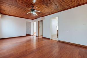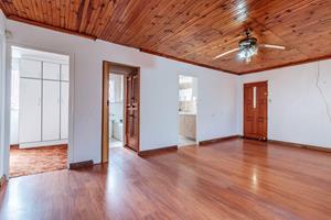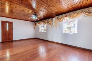 The spacious lounge is a highlight of the home, featuring a beautiful laminated floor, a striking chandelier, and an exquisite wooden ceiling that adds character and warmth to the space.