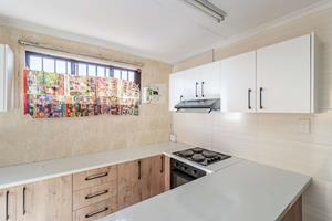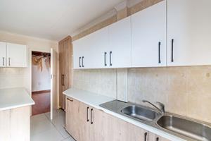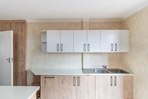 The modern kitchen is a chef's delight, boasting updated built-in cupboards, a double basin sink, and an electric stove with an oven and hob. Like the bathroom, it is also tiled from floor to ceiling, ensuring both practicality and style.