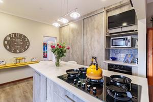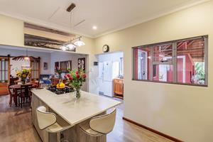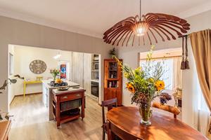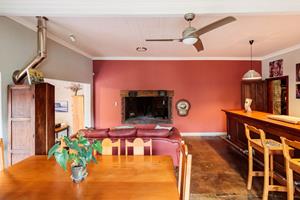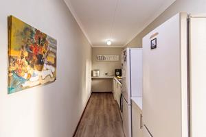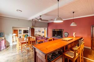 The modern open-plan kitchen is a chef’s delight, boasting an island breakfast nook, gas stove (ideal for loadshedding), electric oven, and sleek vinyl flooring. The adjoining scullery/laundry offers space for all appliances, including dishwasher, washing machine, tumble dryer, fridges, and freezer—complete with a double sink. The kitchen flows into a breakfast/dining area and further into a cozy entertainment zone.