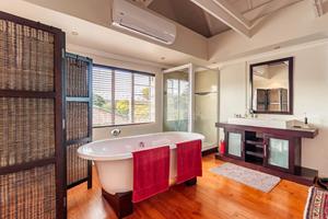 Two more bedrooms await. The fifth bedroom, currently used as a home office, opens onto a balcony overlooking the golf course—perfect for professionals working remotely. The main upstairs bedroom is a true retreat with an open-plan en-suite featuring both bath and shower, plus a separate dressing area.