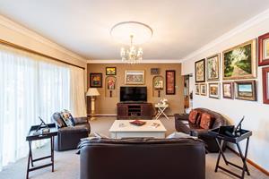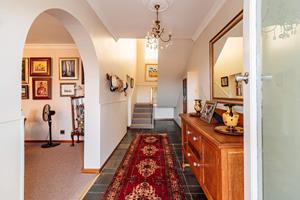 From the moment you enter the grand entrance hall, complete with a chandelier and stylish hat hooks, you’ll know this is no ordinary home. To your left, a sun-drenched formal lounge with plush carpets and full-length curtains sets a warm, inviting tone.