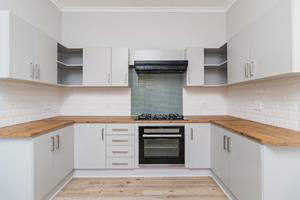 The newly renovated kitchen is both stylish and functional, featuring soft-grey cabinetry, warm wooden countertops, and a free-standing gas oven that will delight any home chef. A separate scullery/laundry provides ample space for appliances, keeping the main kitchen uncluttered and elegant.