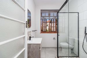 A spacious main bedroom with built-in cupboards and a beautifully appointed en-suite bathroom