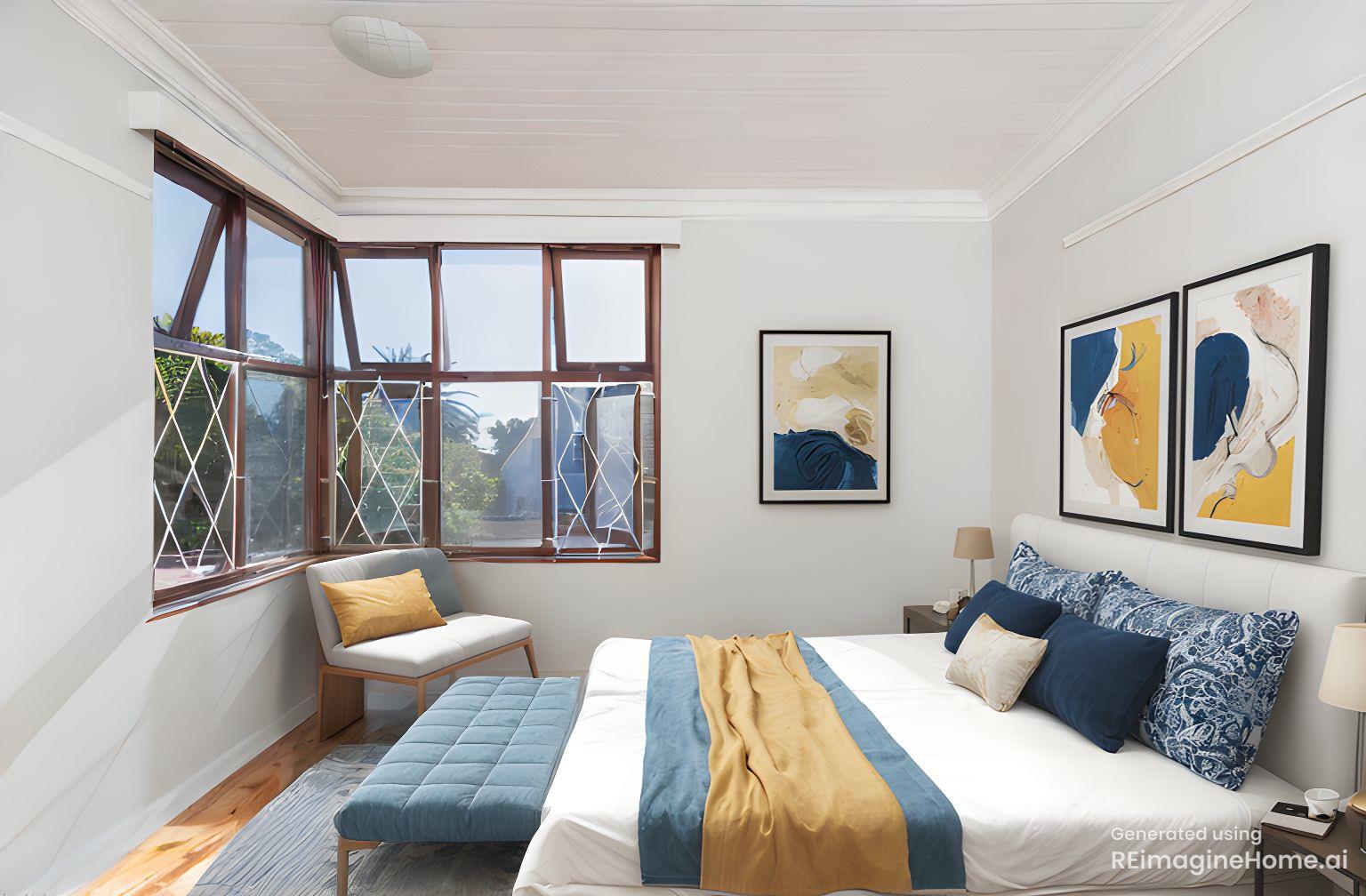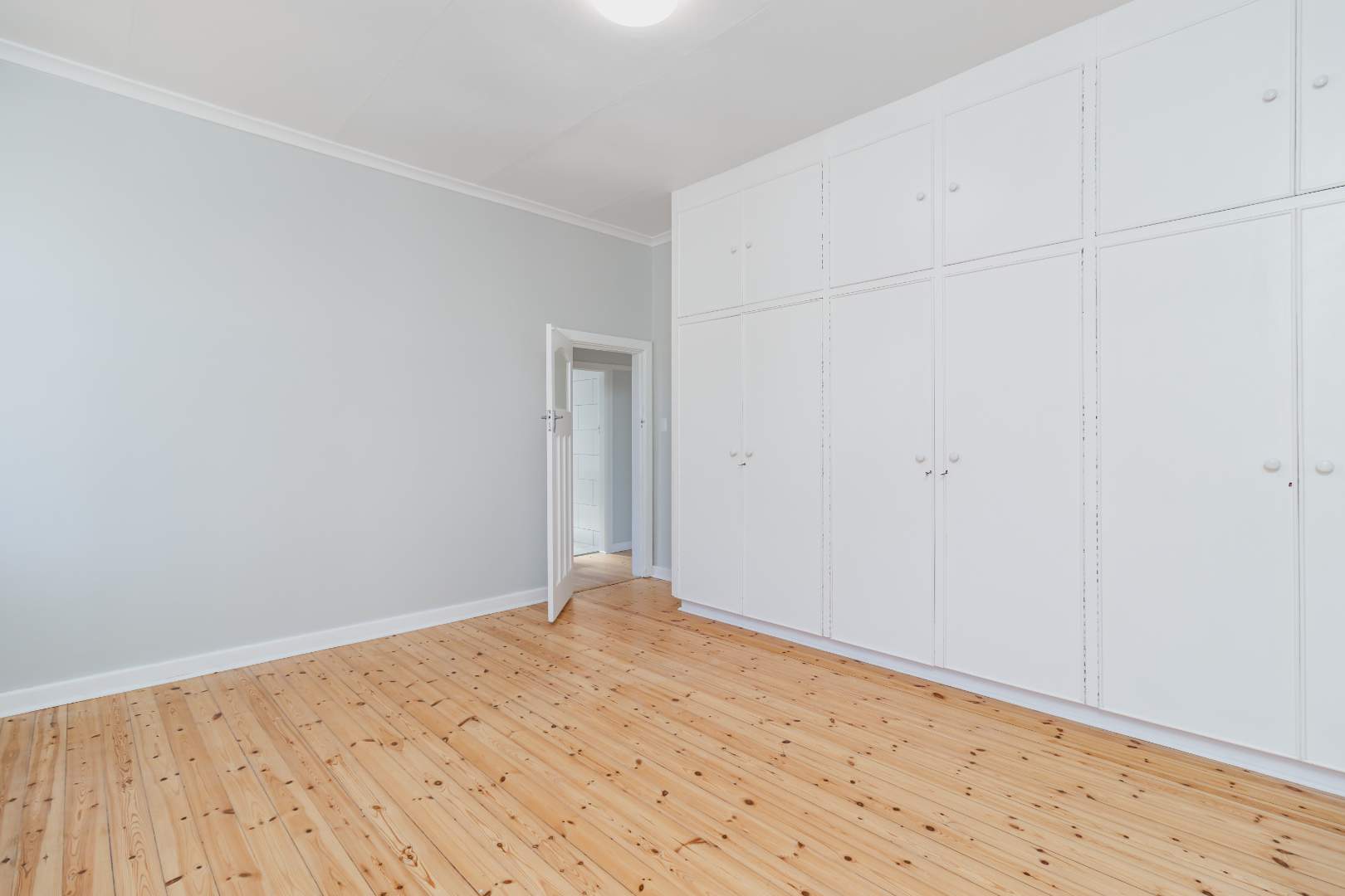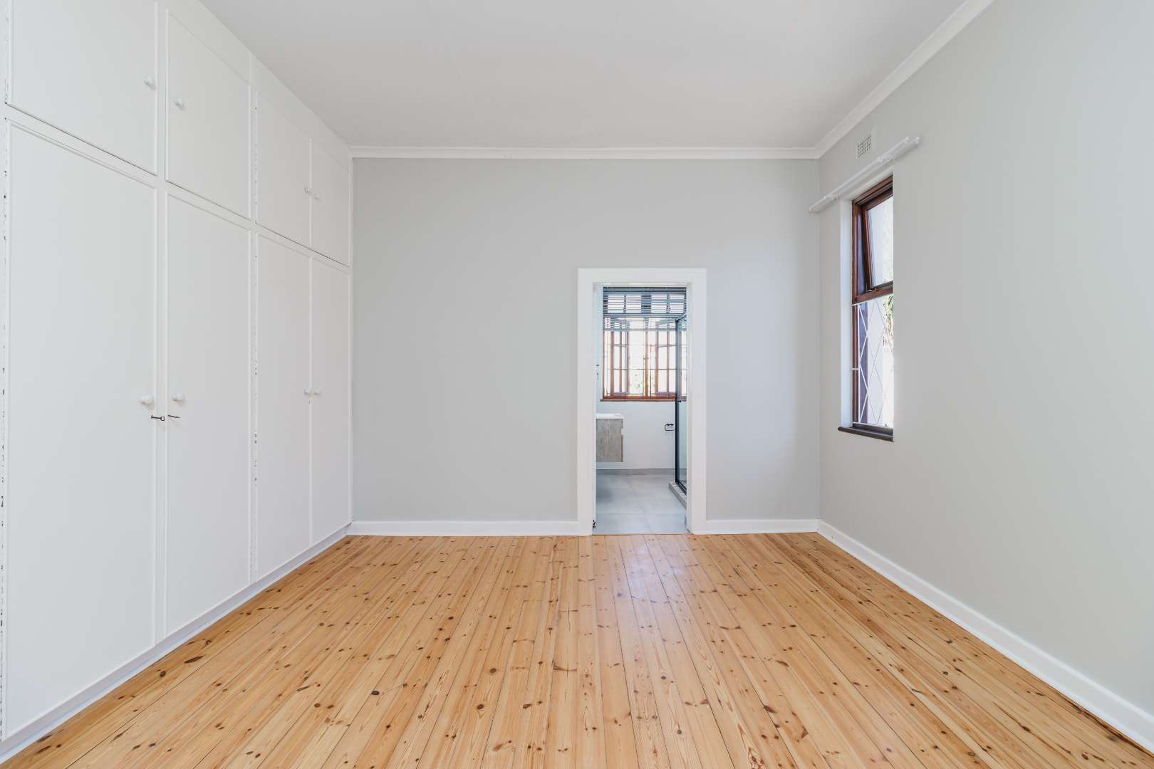 A spacious main bedroom with built-in cupboards and a beautifully appointed en-suite bathroom