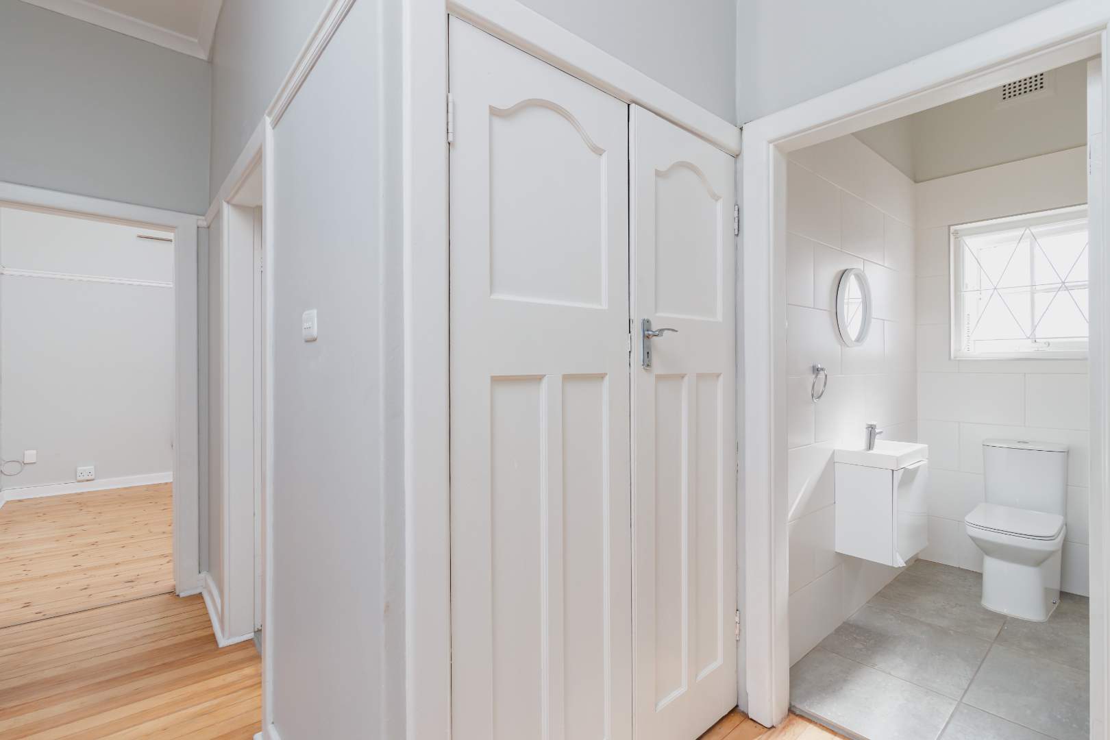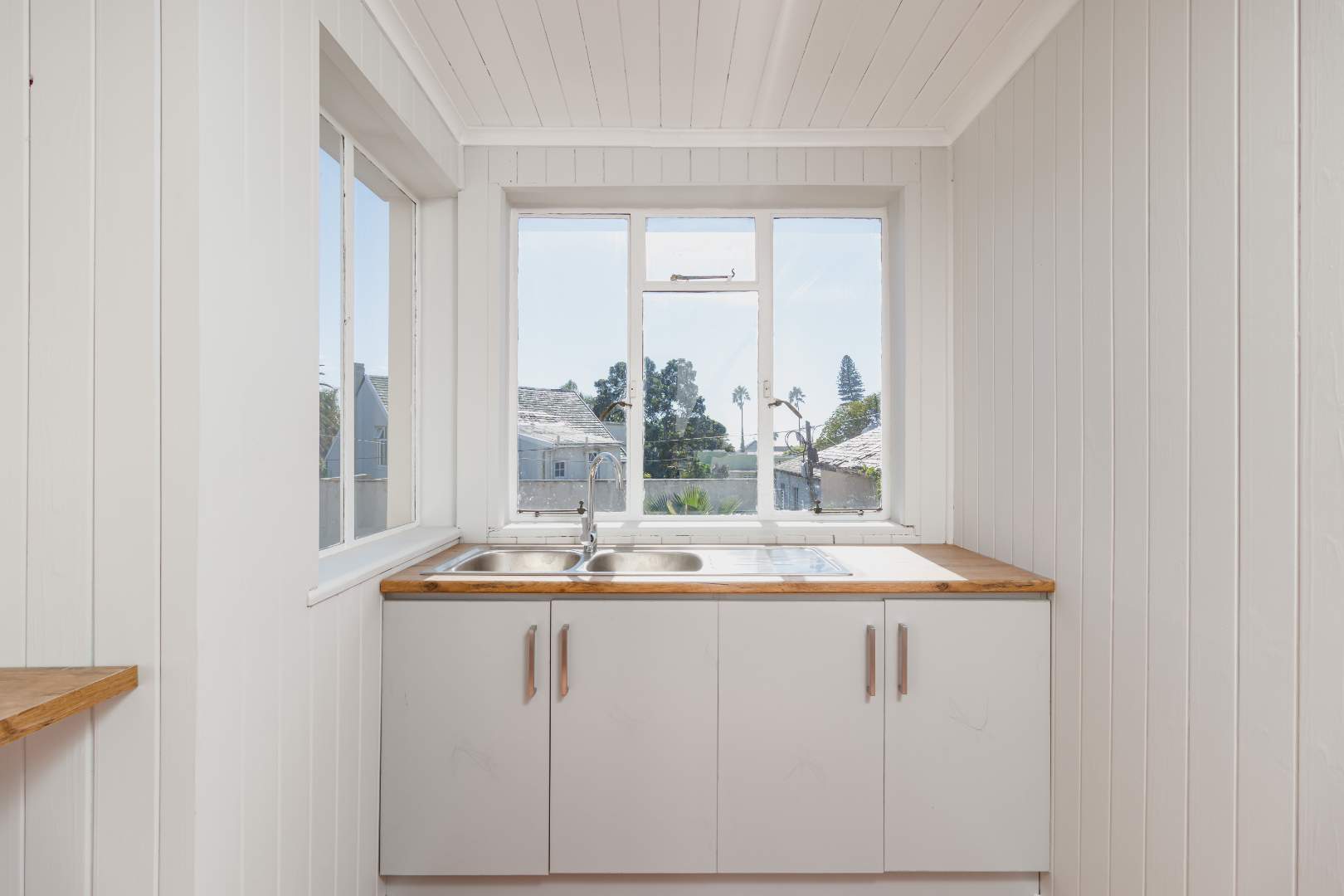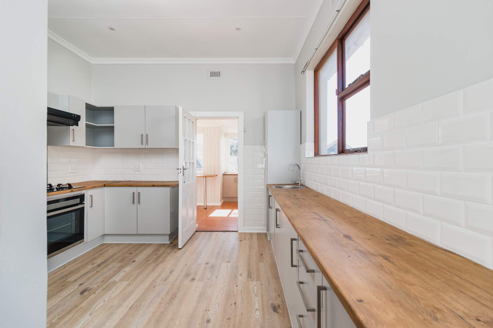 The newly renovated kitchen is both stylish and functional, featuring soft-grey cabinetry, warm wooden countertops, and a free-standing gas oven that will delight any home chef. A separate scullery/laundry provides ample space for appliances, keeping the main kitchen uncluttered and elegant.