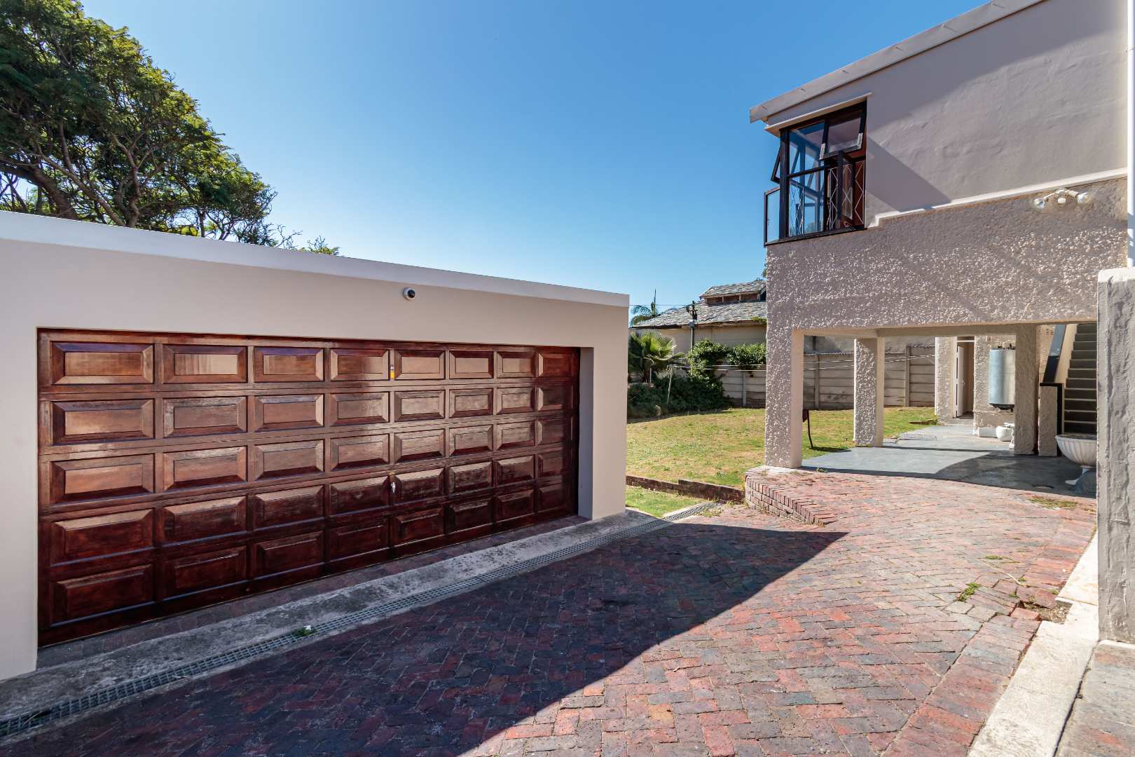 Outside, the property features a low-maintenance garden and paved courtyard area, complemented by two double garages with elegant wooden doors and additional off-street parking.