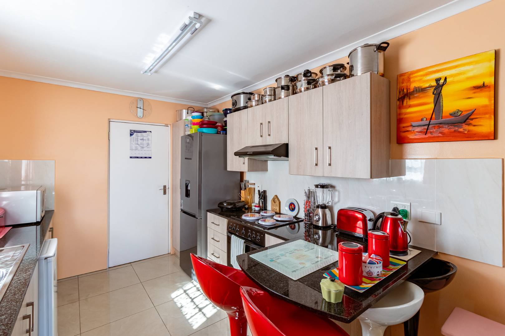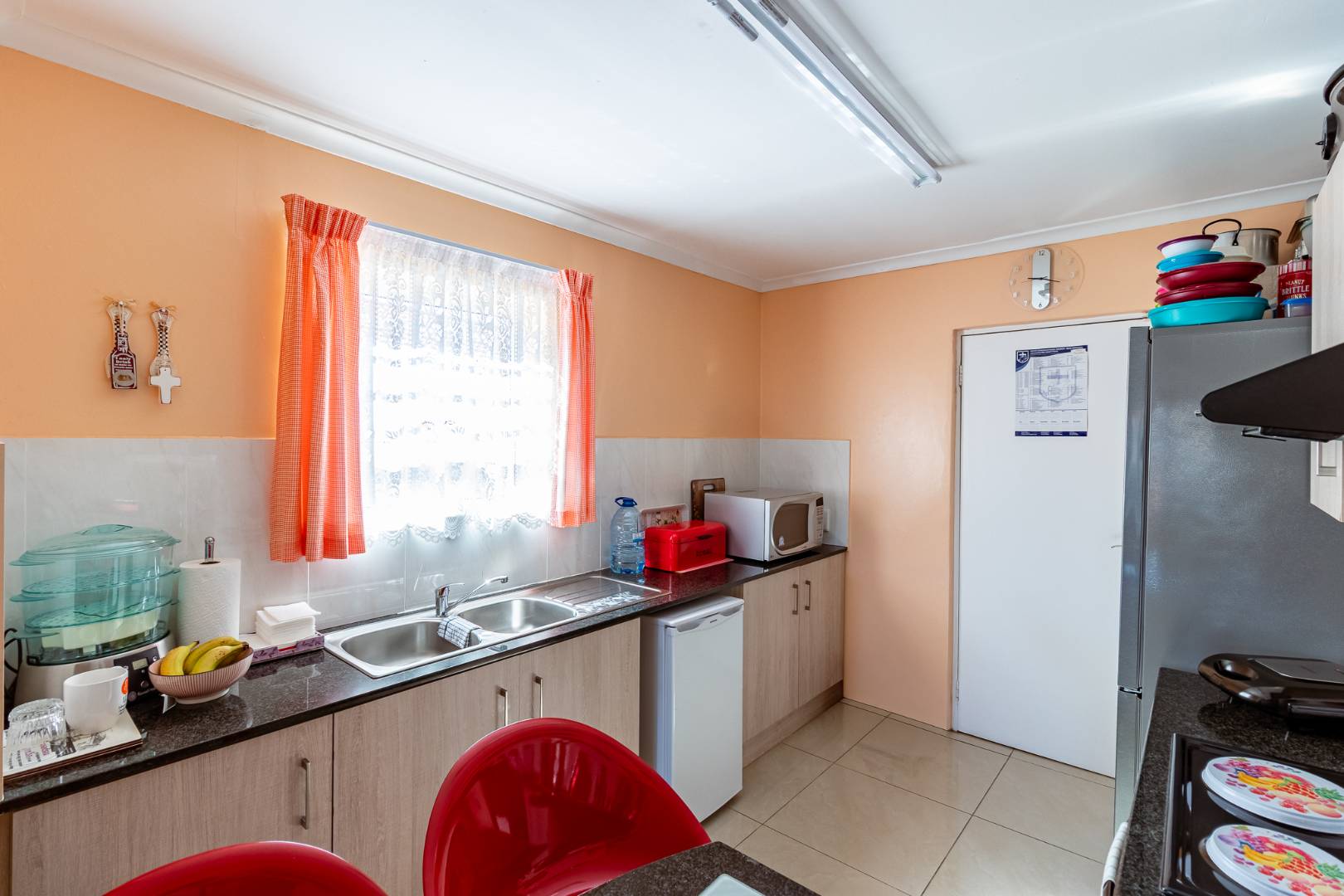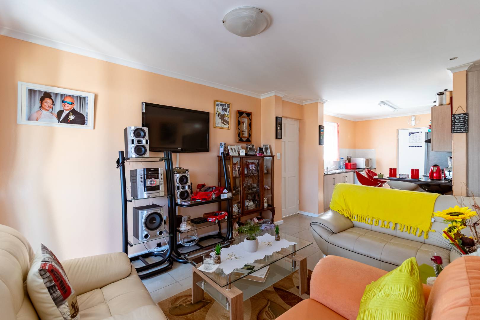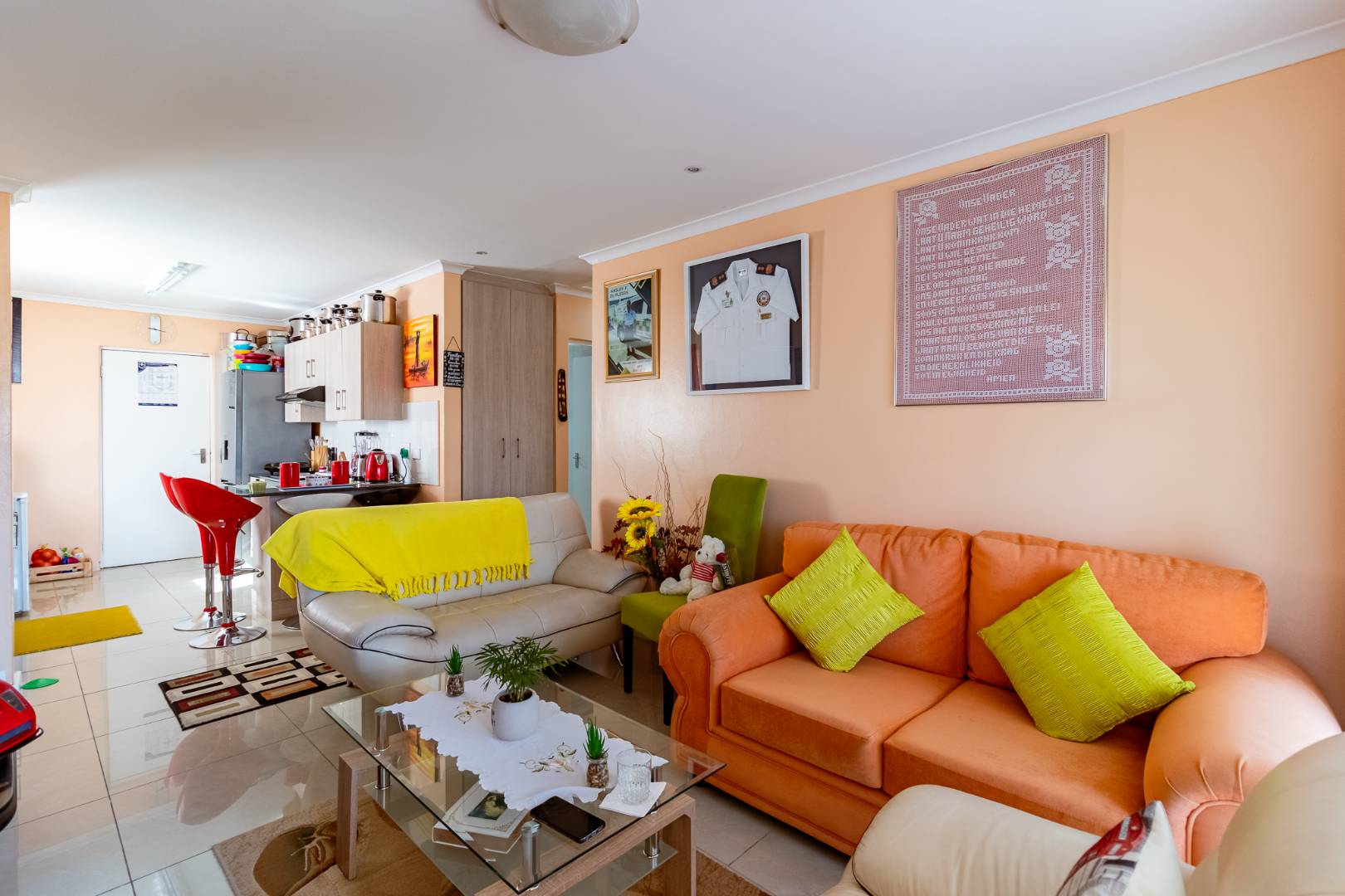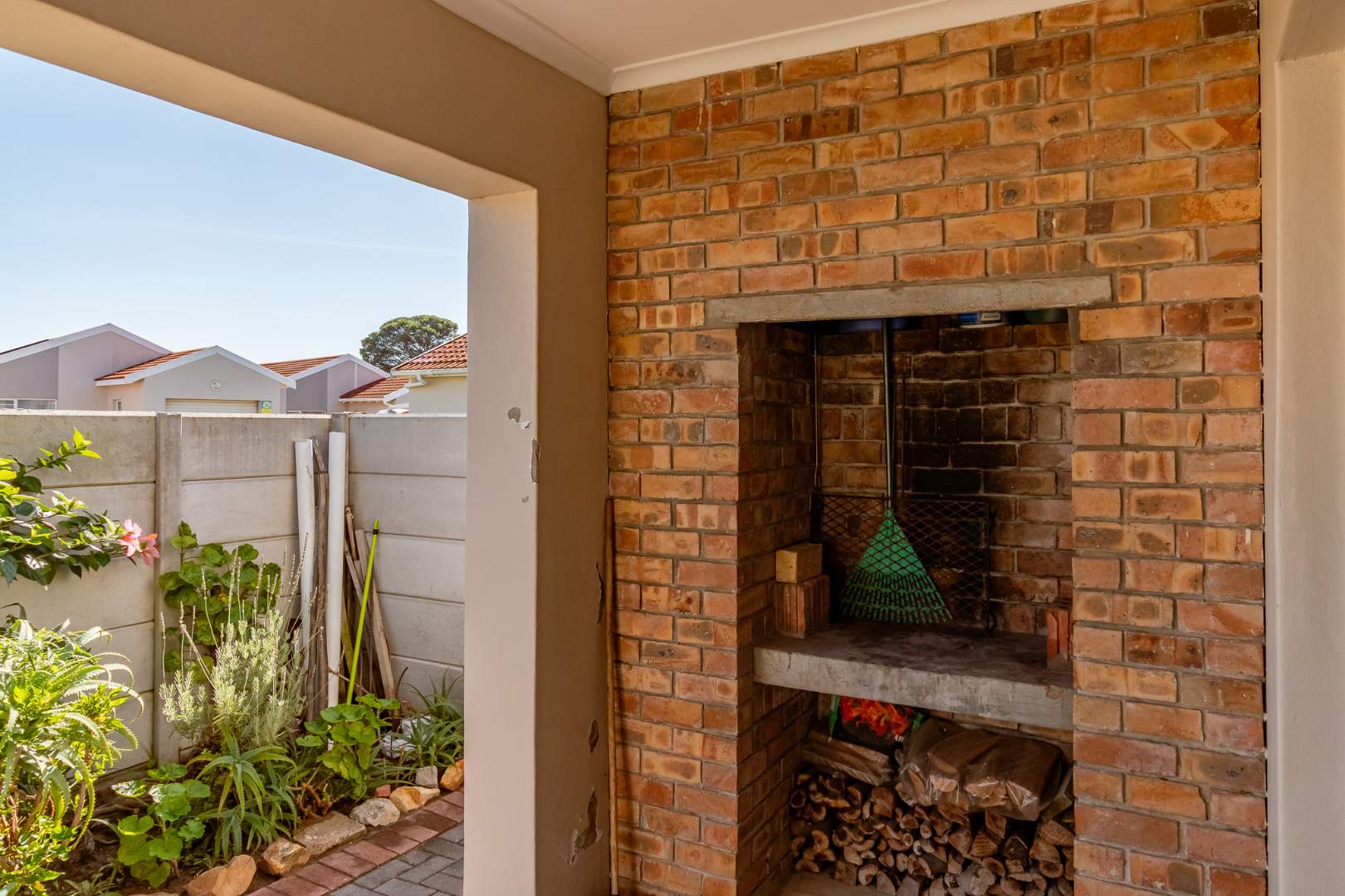The home boasts an open-plan kitchen and lounge area, designed for easy living and entertaining. Sliding doors lead to a neat, enclosed stoep with a cozy fireplace — ideal for relaxing evenings or hosting guests all year round.
