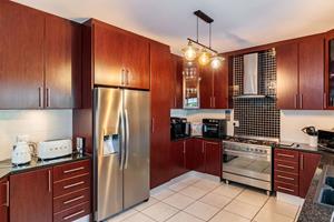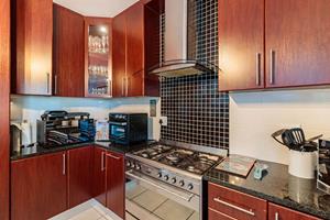 ✔ Modern kitchen with mahogany cupboards, marble countertops, gas stove, extractor, and oven