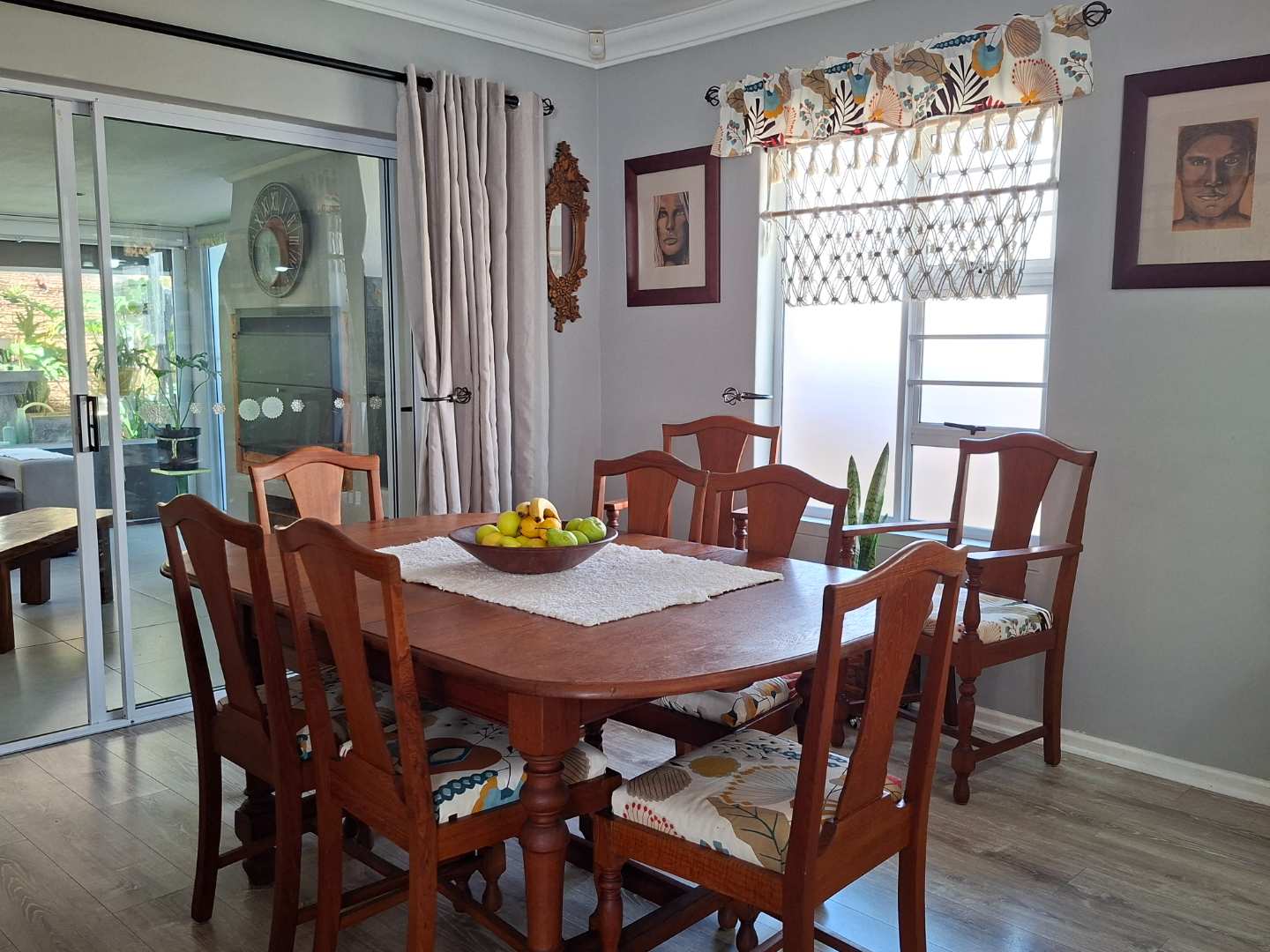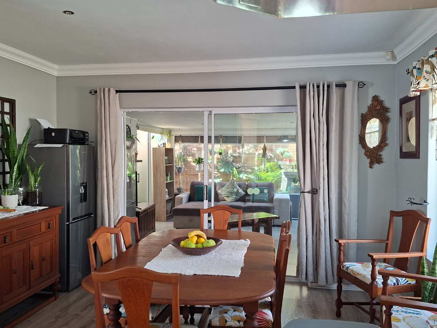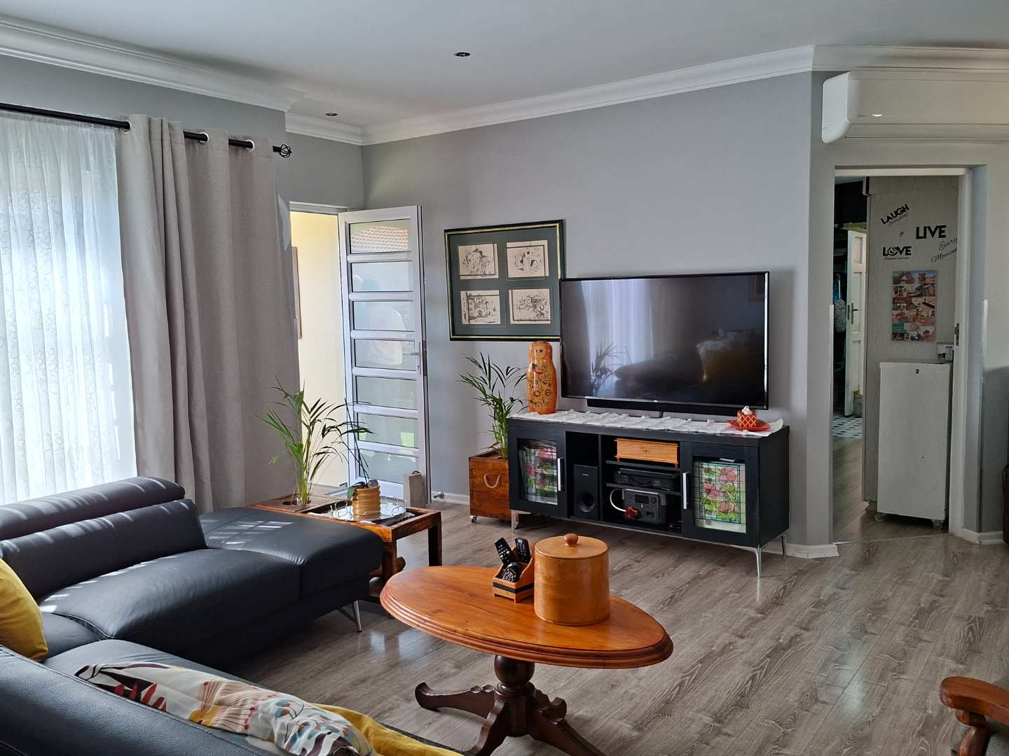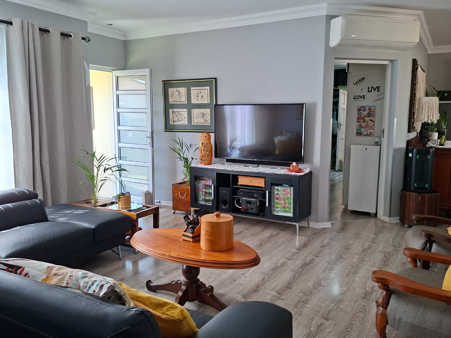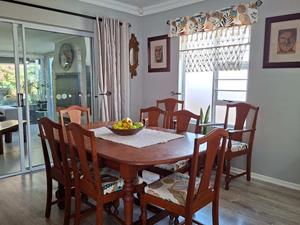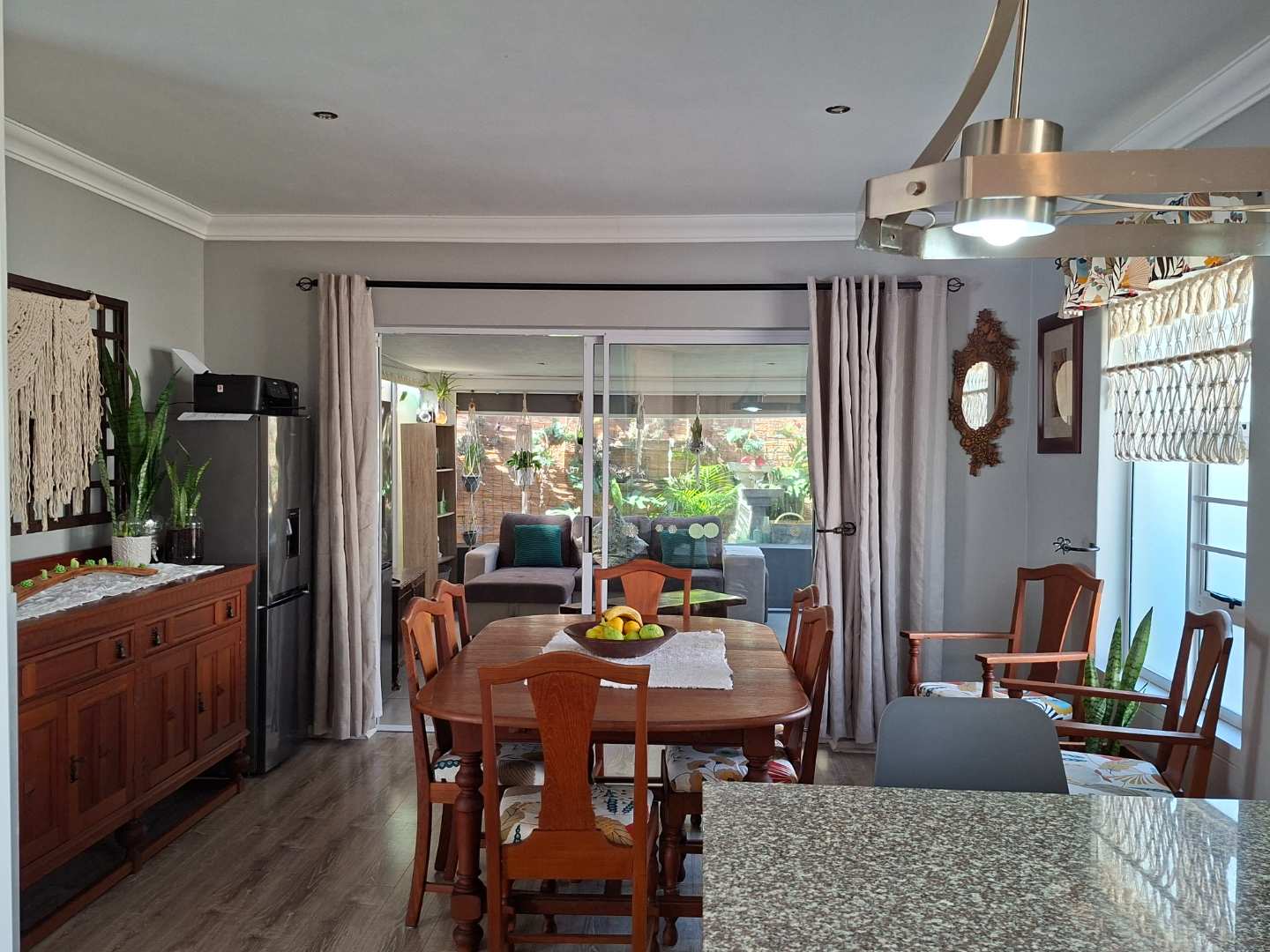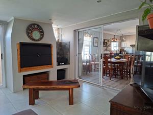 The heart of the home is the expansive open-plan living area, seamlessly combining the lounge, dining room, and an indoor braai/entertainment area. This versatile space is perfect for hosting gatherings or enjoying quiet evenings with family and friends.