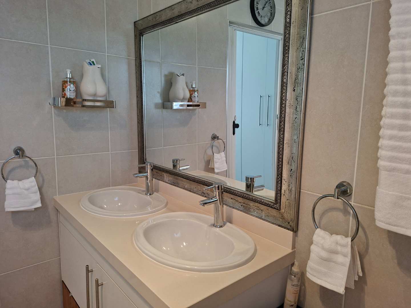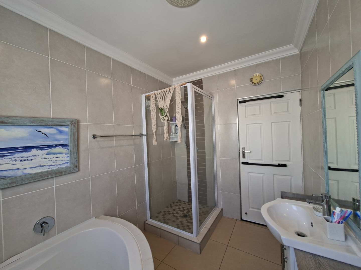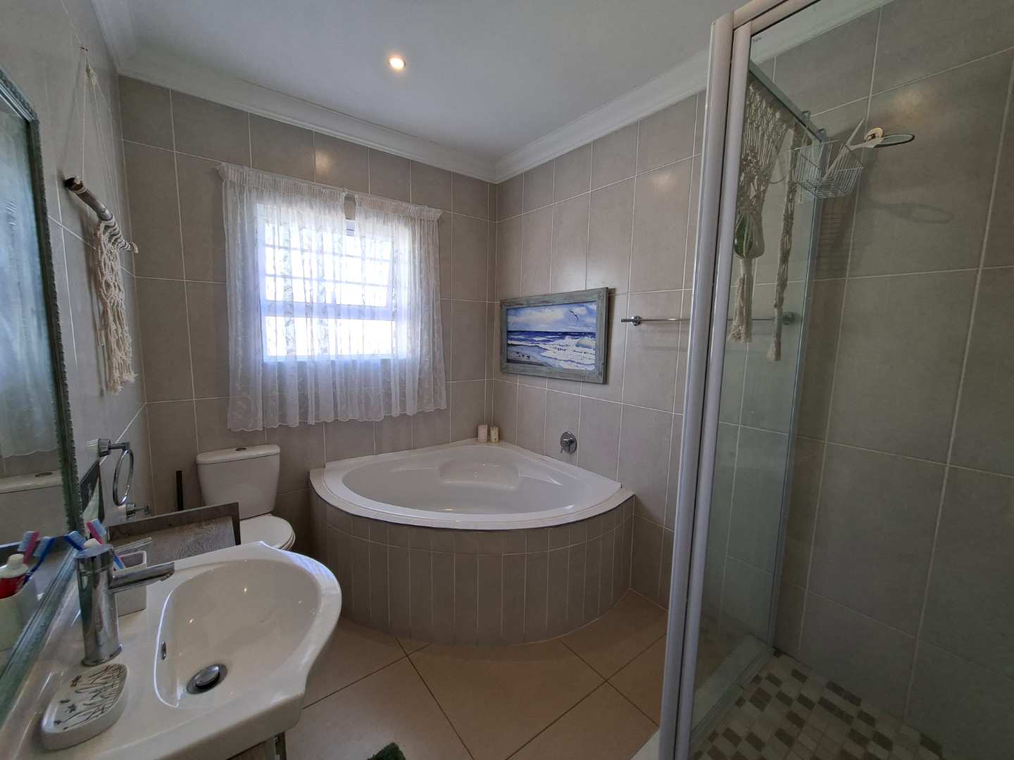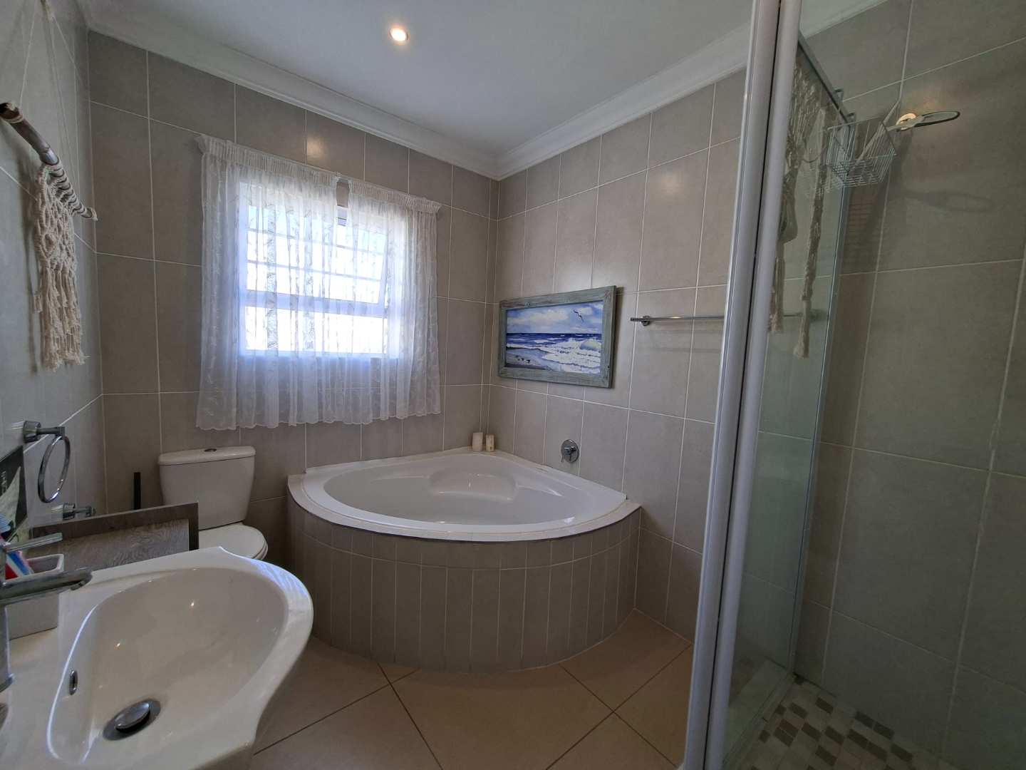 Step inside to discover three generously sized bedrooms, each featuring ample built-in cupboards that provide abundant storage space. The main bedroom is a true retreat, complete with a luxurious en-suite bathroom that boasts a corner bath, shower, double basin, and toilet. The additional two bedrooms are equally spacious and share a well-appointed family bathroom, complete with a bath, shower, basin, and toilet.