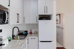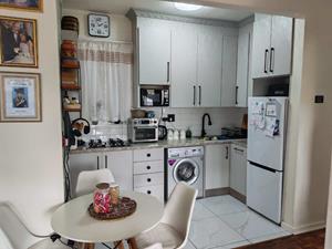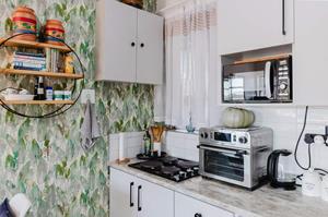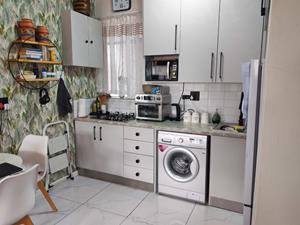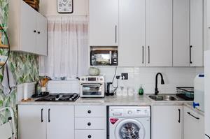The apartment welcomes you into a light and airy open-plan living space that flows effortlessly into a modern fitted kitchen, creating a warm and practical layout.