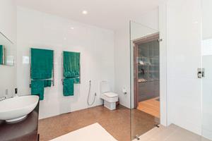 Generously sized, with sliding doors leading to the deck and a full en-suite bathroom (bath, shower, basin) finished with durable epoxy flooring.