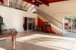 Upstairs, a spacious living room with guest toilet leads to a stunning indoor braai room — complete with exposed trusses.